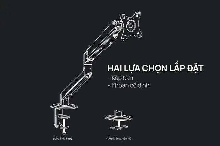 Các bạn có thể cố định chiếc giá đỡ màn hình Human Motion T6 Pro bằng 2 cách bao gồm kẹp bàn hoặc khoan cố định. Cực kì chắc chắn để các bạn có thể hoàn toàn yên tâm sử dụng.