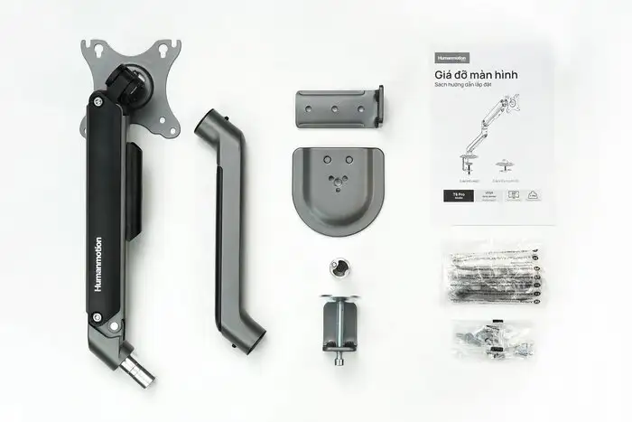 Khi các bạn mua chiếc giá đỡ màn hình Human Motion T6 Pro, ngoài chiếc giá đỡ, các bạn còn được tặng kèm 1 bộ công cụ lắp đặt và 1 bộ sách hướng dẫn lắp đặt để các bạn có thể tự mình lắp đặt chiếc giá đỡ.