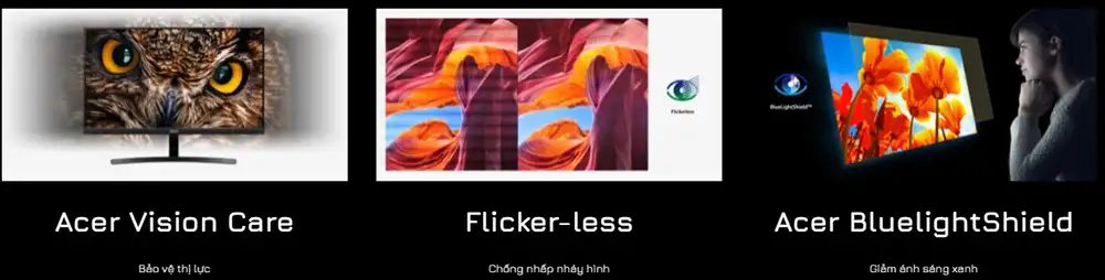 Không chỉ sở hữu thông số kỹ thuật ấn tượng trong tầm giá phổ thông từ 3 đến 4 triệu đồng, Acer còn trang bị cho bộ đôi màn hình Nitro KG0 Series 2025 – KG240Y X1 & KG270 X1 bộ công cụ Acer VisionCare bảo vệ thị lực cho nhu cầu sử dụng lâu dài của người dùng như các Game thủ, lập trình viên, nhà văn, nhân viên văn phòng, học sinh sinh viên hay nhà thiết kế đồ họa – giúp giảm mỏi mắt và mang lại trải nghiệm sử dụng thoải mái nhất.