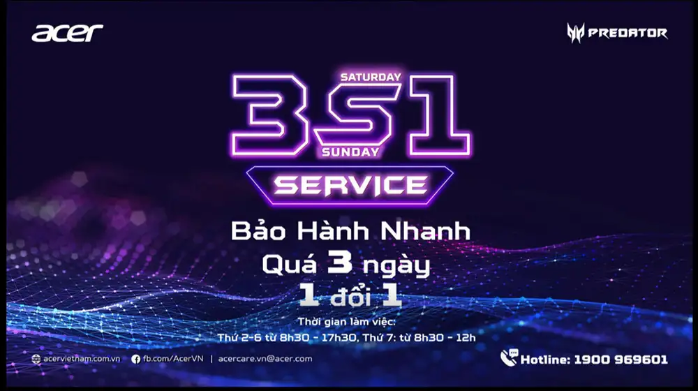 3S1 là chính sách bảo hành VIP của Acer Predator và là duy nhất tại Việt Nam. Những dòng sản phẩm Gaming như màn hình Nitro KG240Y X1 sẽ được kiểm tra, bảo hành và gửi lại khách chỉ trong thời gian ngắn: 03 ngày (72 giờ) bao gồm cả thứ 7, Chủ nhật. Đặc biệt hơn nữa, khách hàng sẽ được nhận sản phẩm mới cùng loại hoặc tương đương (1 đổi 1) cho các trường hợp không hoàn thành bảo hành trong 03 ngày tính từ lúc nhận sản phẩm.